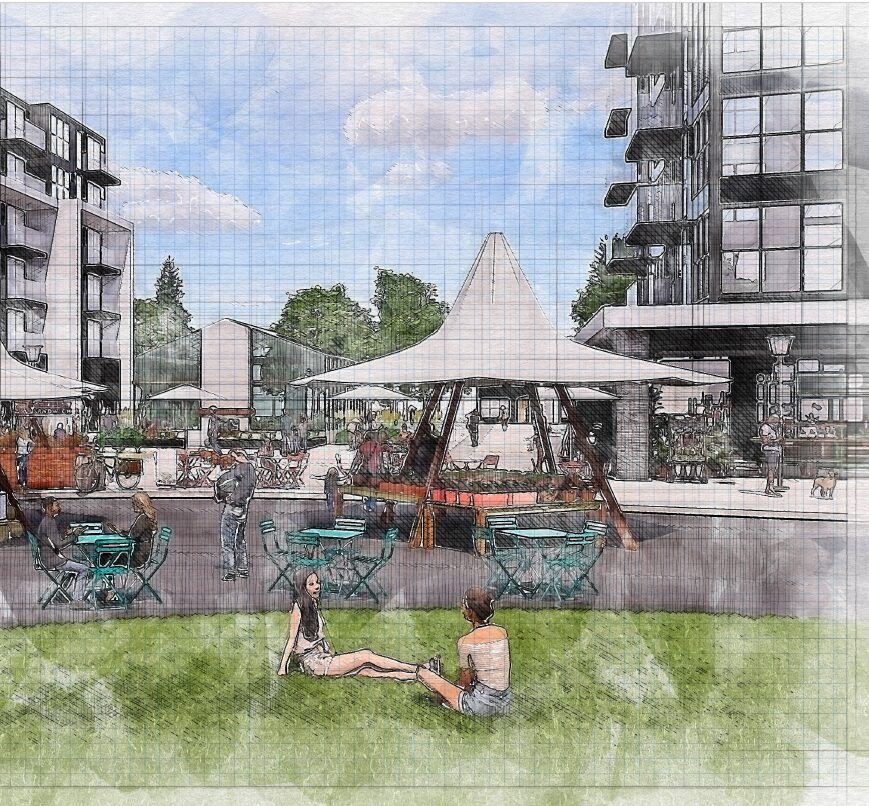 Concept rendering of Mercado Street with ground-floor retail, wide sidewalks, and landscaped gathering areas.