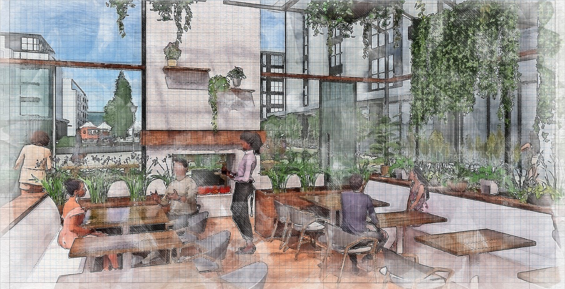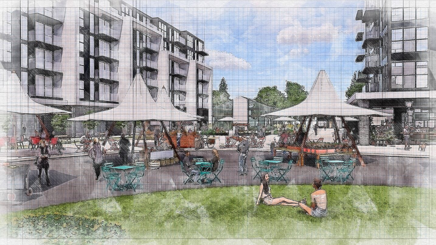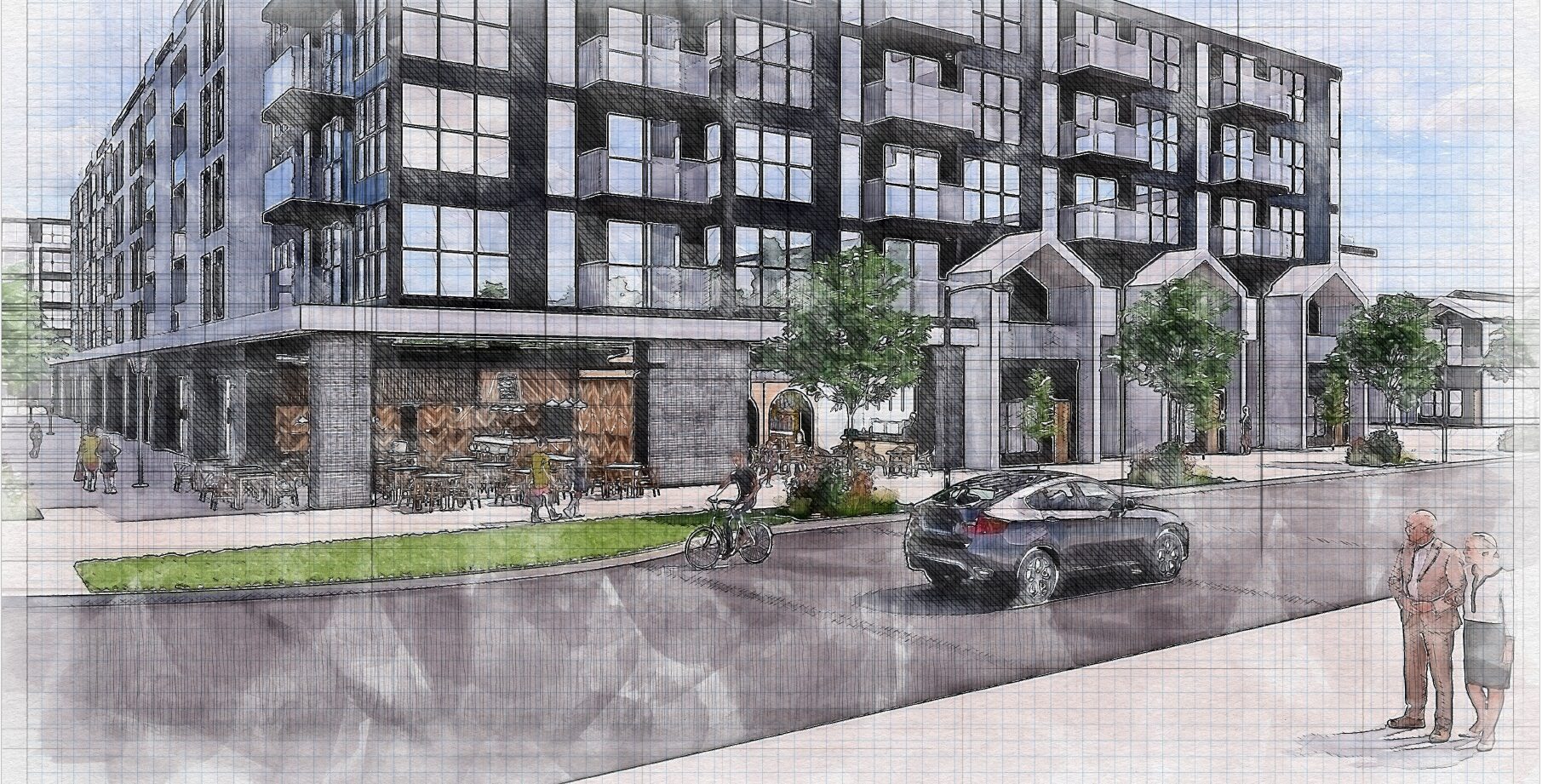 Concept rendering of Mercado Street with ground-floor retail, wide sidewalks, and landscaped gathering areas.